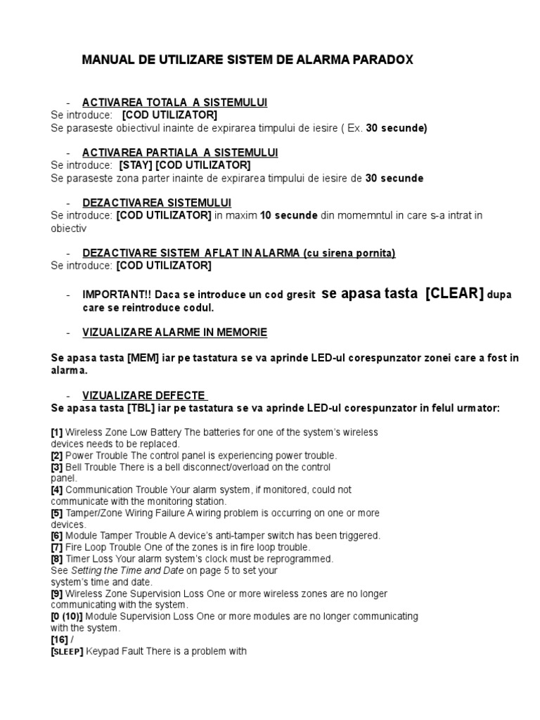 Alarma Paradox Manual Utilizare