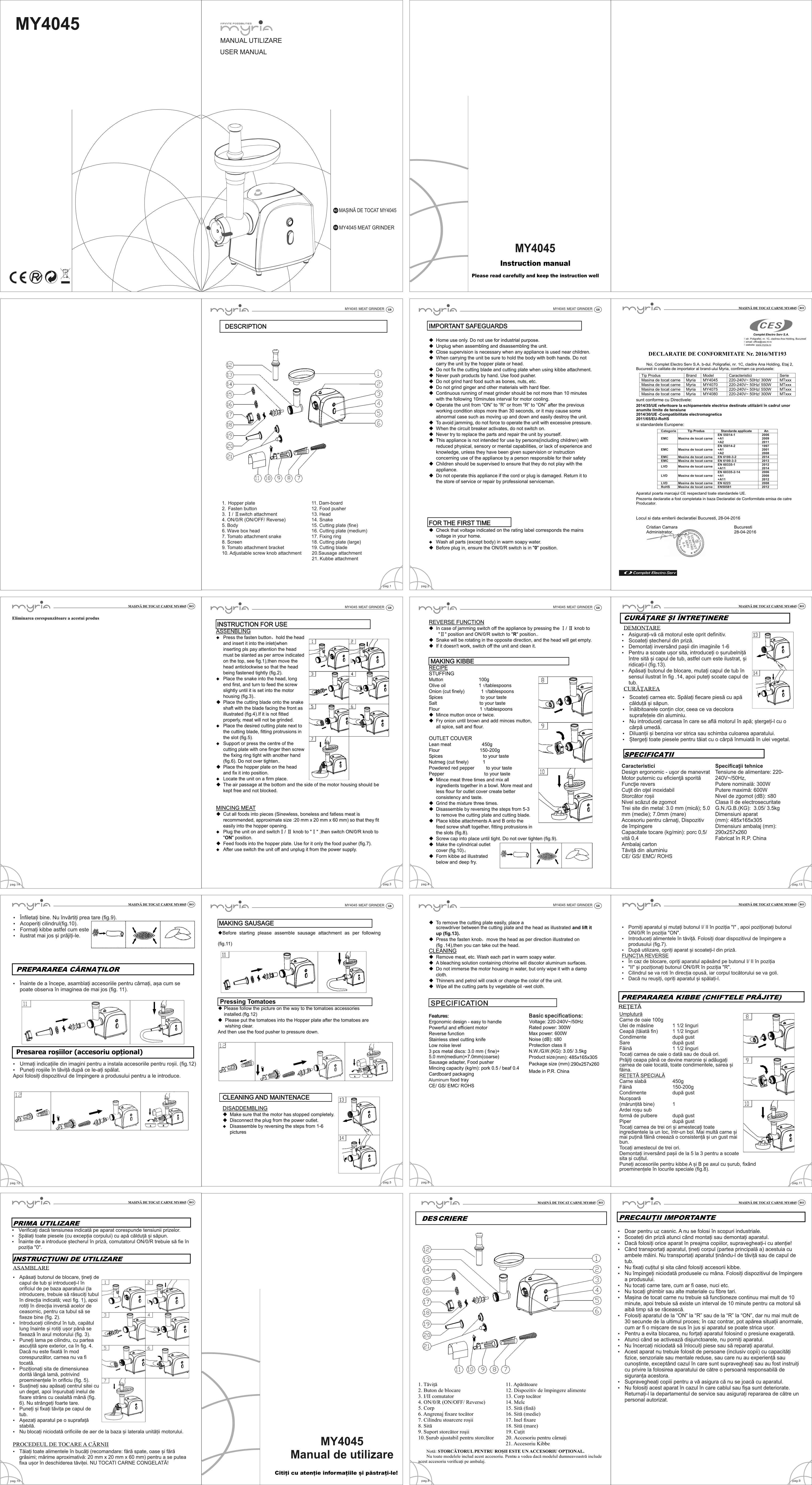 Masina De Tocat Carne Myria My4075 0 5kg Min 1200w Accesoriu Carnati Suc De Rosii Kebbe